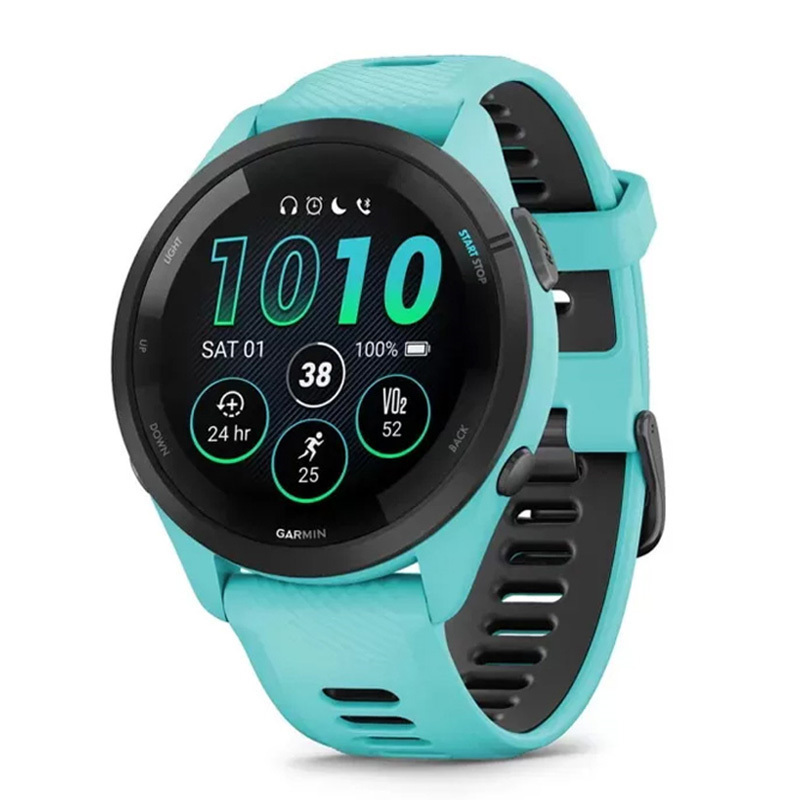 Forerunner 265 Black Bezel with Aqua Case and Aqua/Black Silicone Band PART NUMBER 010-02810-12