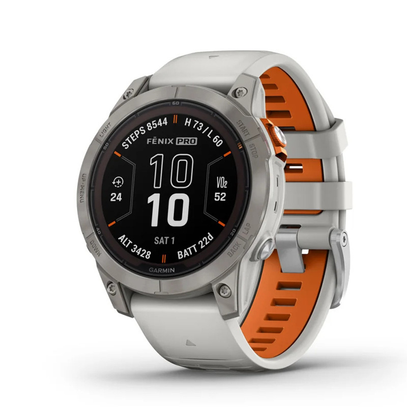 fēnix® 7 Pro – Sapphire Solar Edition Titanium with Fog Gray/Ember Orange Band PART NUMBER010-02777-21