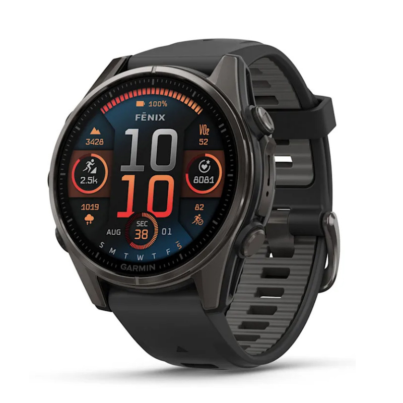 fēnix® 8 – 43 mm, AMOLED Sapphire, Carbon grey DLC titanium with Black/pebble grey silicone band PART NUMBER010-02903-21